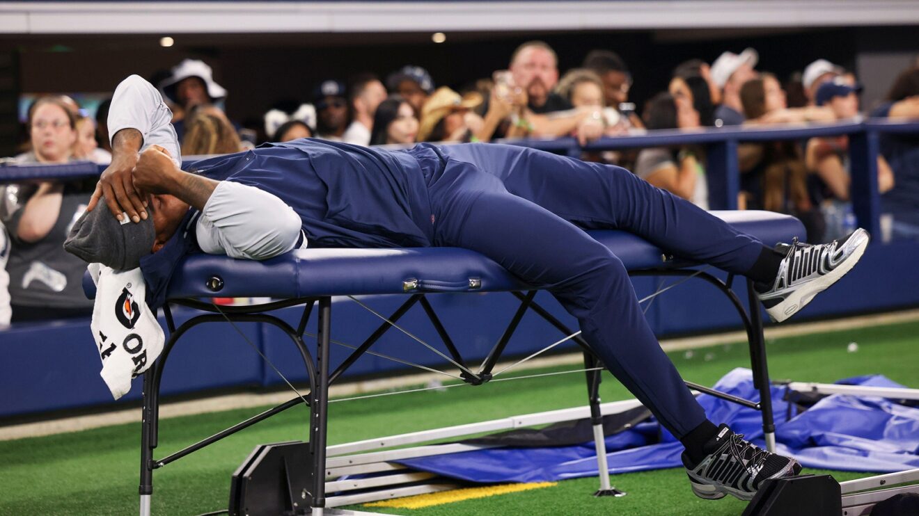 The NFL All-Pro edge rusher has not played this summer, yet he still managed to grab the spotlight. Cameras caught him lying on a training table behind the bench while his teammates were on offense.